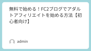 Uncategorized 無料で始める!FC2ブログでアダルトアフィリエイトを始める方法【初心者向け】 無料で始める!FC2ブログでアダルトアフィリエイトを始める方法【初心者向け】こんにちは!この記事では、「お金をかけずにアダルトアフィリエイトを始めたい」方向けに、無料ブログの代表格「FC2ブログ」での始め方をわかりやすく解説します。有料サー... 2025.06.30 Uncategorized